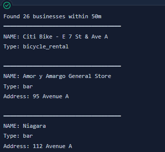 For this one, I expected a really densely populated street map, so I limited the distance radius to 50 meters. I’m just experimenting. I wanted to see any business within 50 meters of this event.